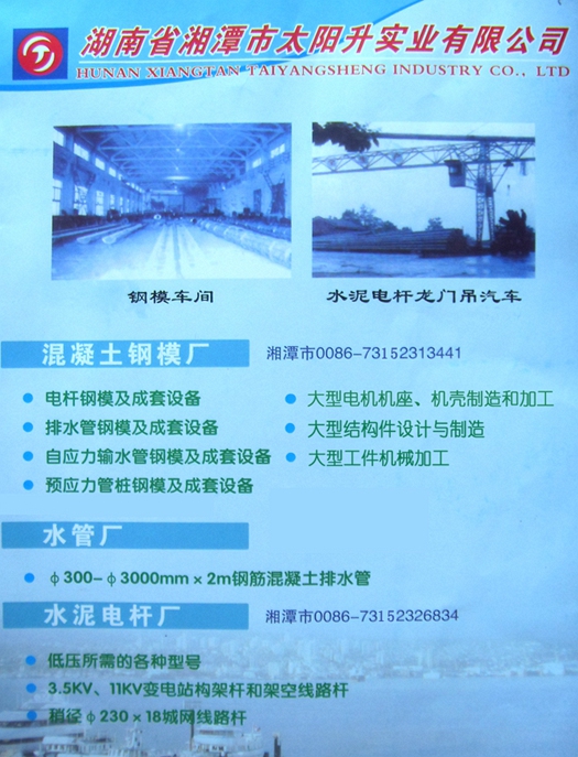 1、鋼模制造廠: ①電桿鋼模及成套設(shè)備和技術(shù)服務(wù); ②給排水管鋼模及成套設(shè)備和技術(shù)服務(wù); ③預(yù)應(yīng)力管樁鋼模及成套設(shè)備和技術(shù)服務(wù); ④預(yù)應(yīng)力高強(qiáng)絲生產(chǎn)成套設(shè)備和技術(shù)服務(wù); ⑤大型結(jié)構(gòu)件設(shè)計與制造。 2、預(yù)應(yīng)力水泥電桿廠: 高、低壓線路桿和構(gòu)架桿,錐型;等徑 、系列配件。 3、排水管廠: 生產(chǎn)Φ200~Φ400×2m平口、企口、承插、頂管等系列產(chǎn)品,為鐵路、公路、排污、引水、市政、房建等工程配套使用。